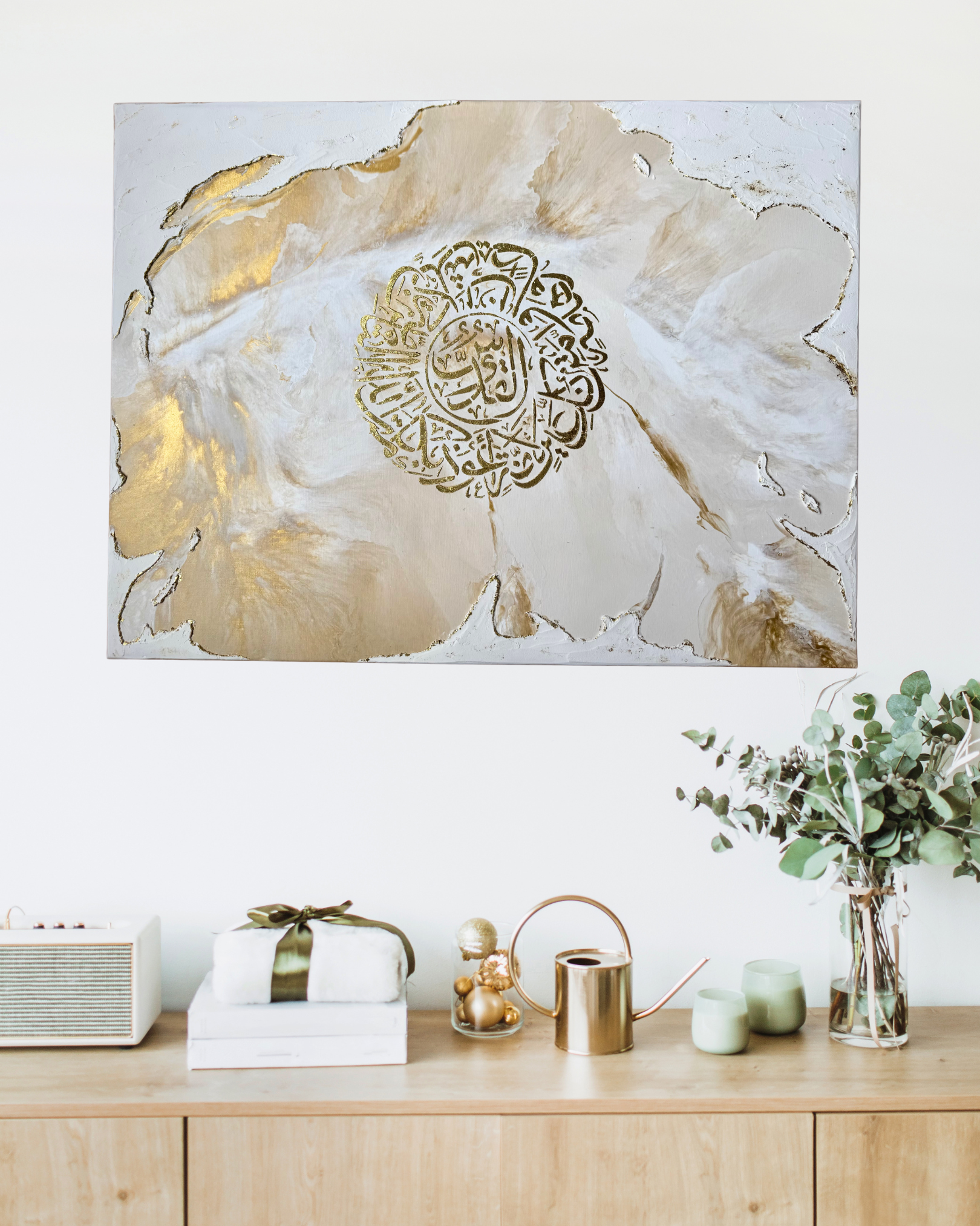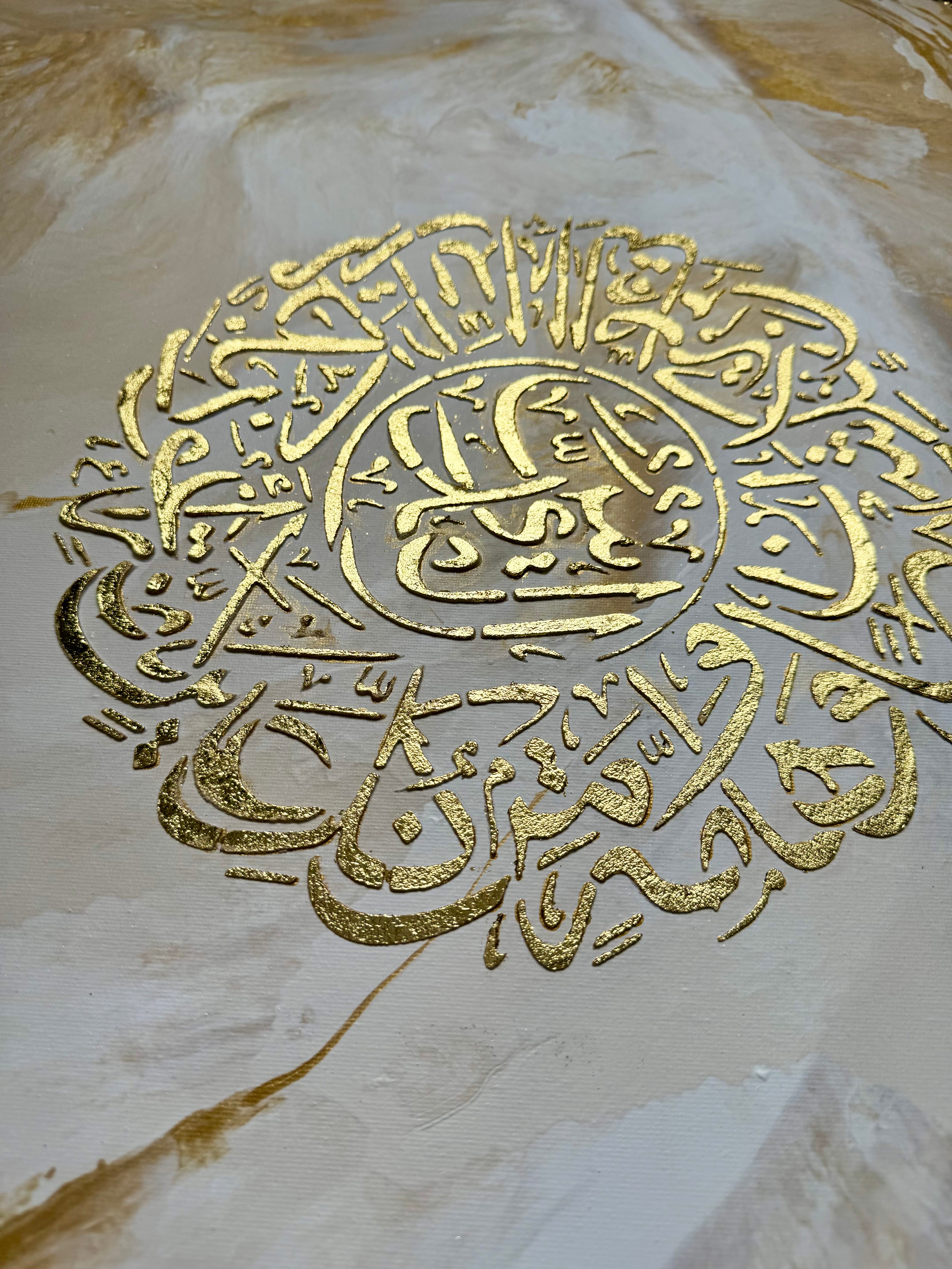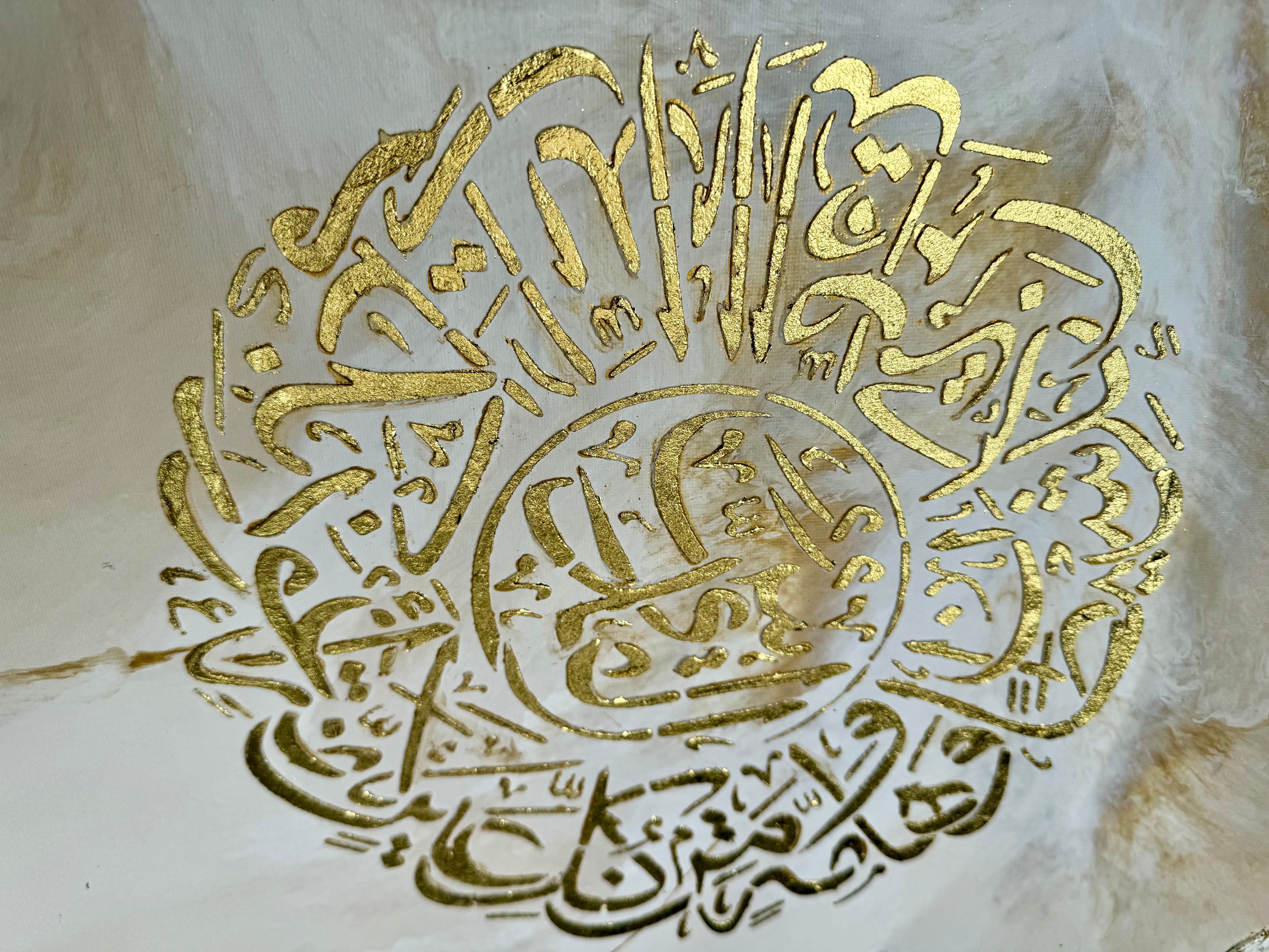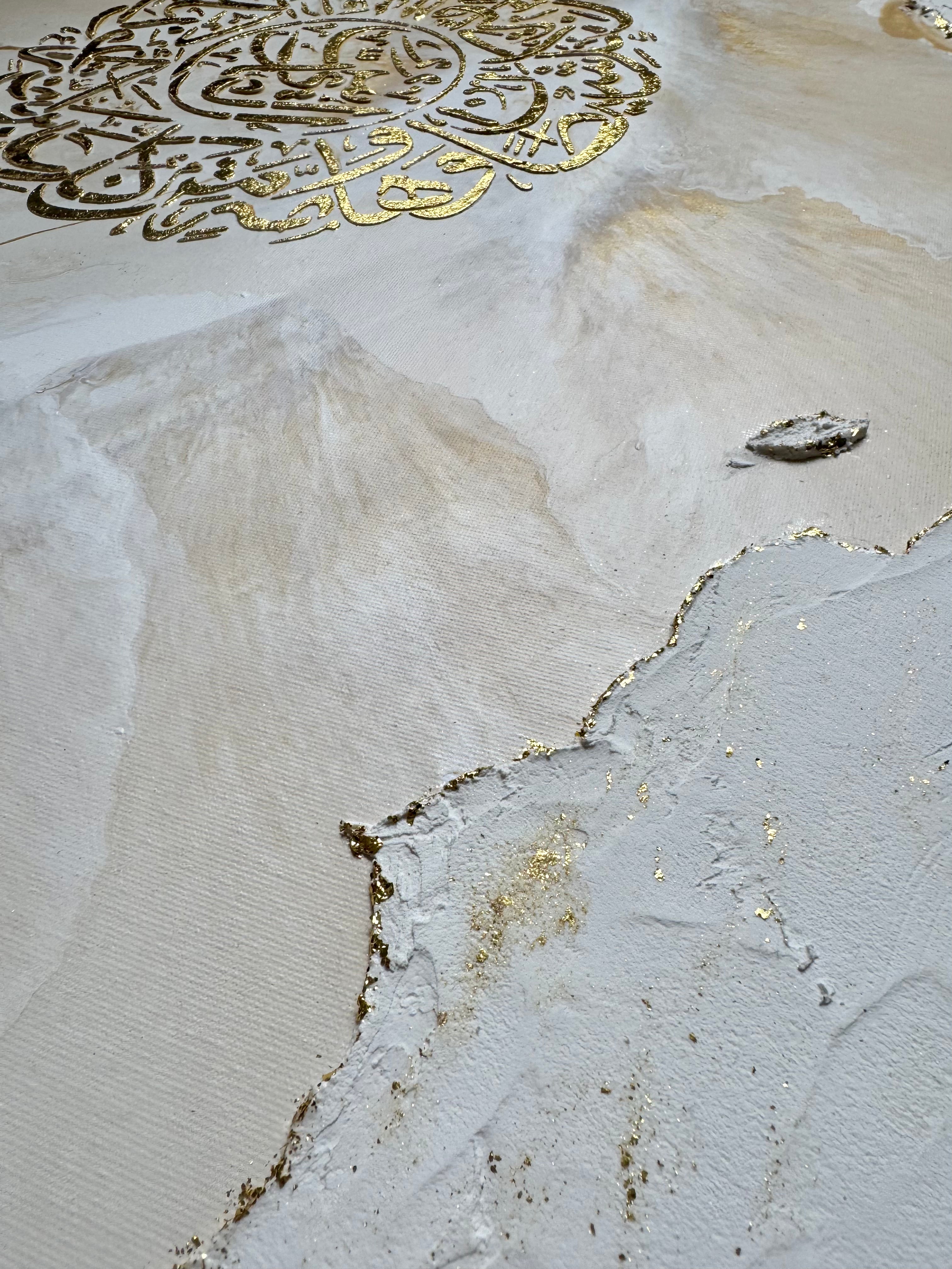An abstract artwork measuring 80 x 60 cm , handmade, blending contemporary minimalism and subtle spirituality . On a textured white background, enhanced with delicate touches of gold leaf , a customizable sacred surah is placed at the center, sculpted in relief and sublimated by gold.