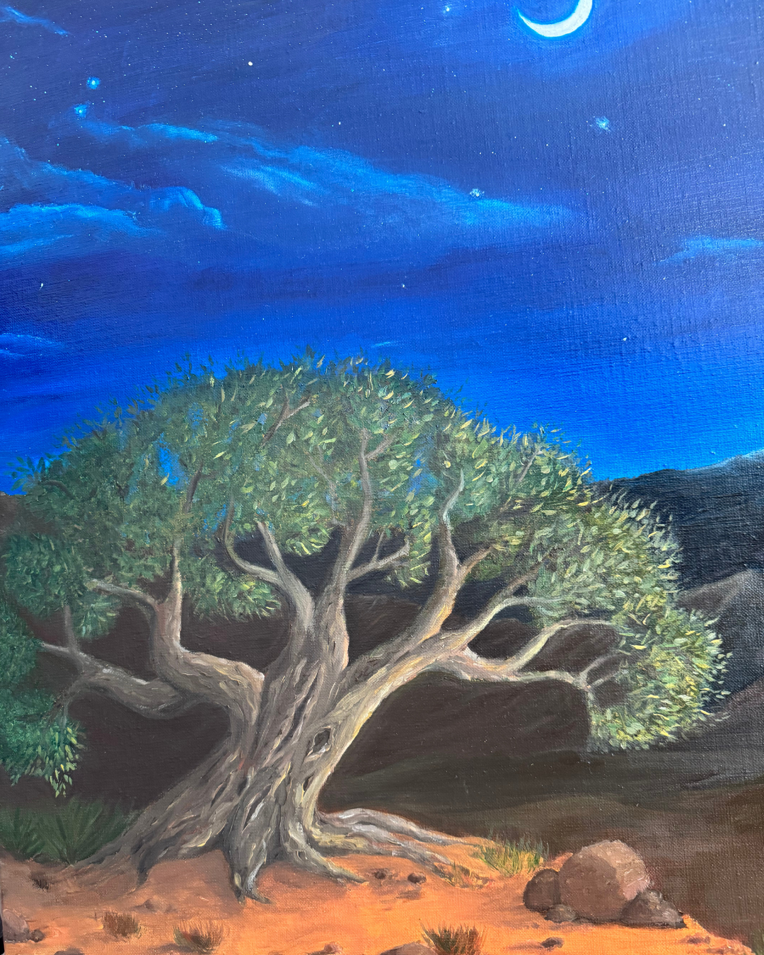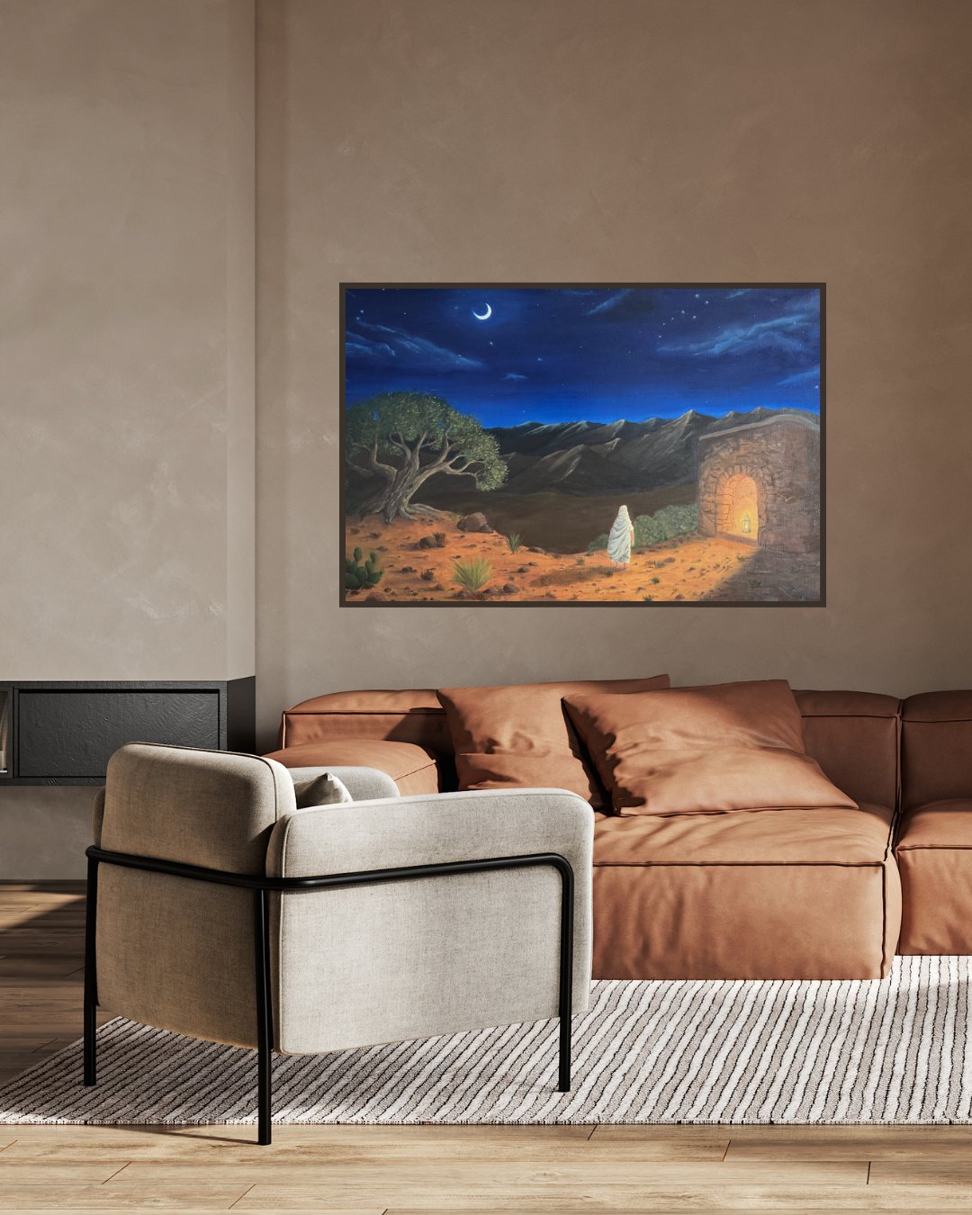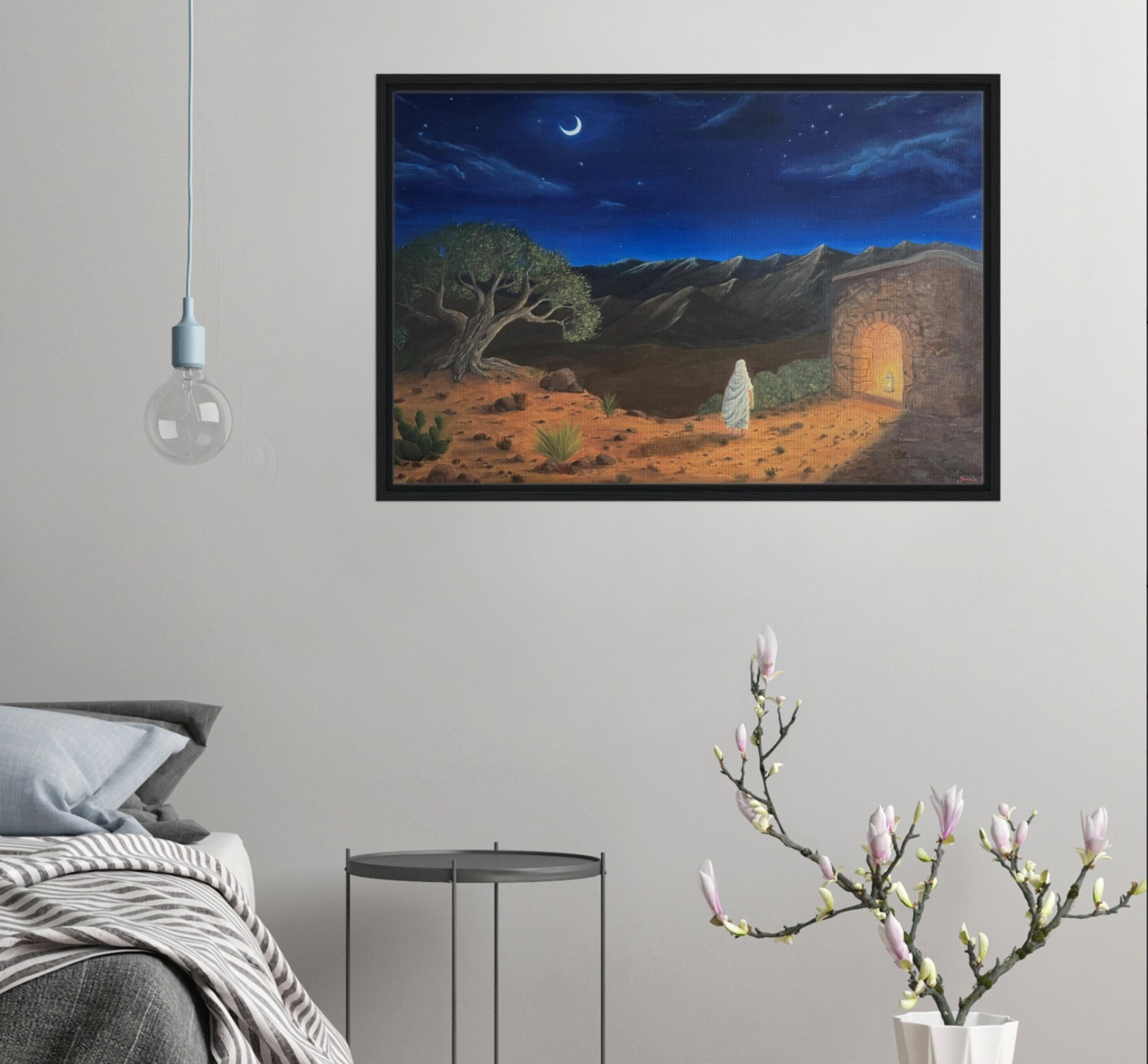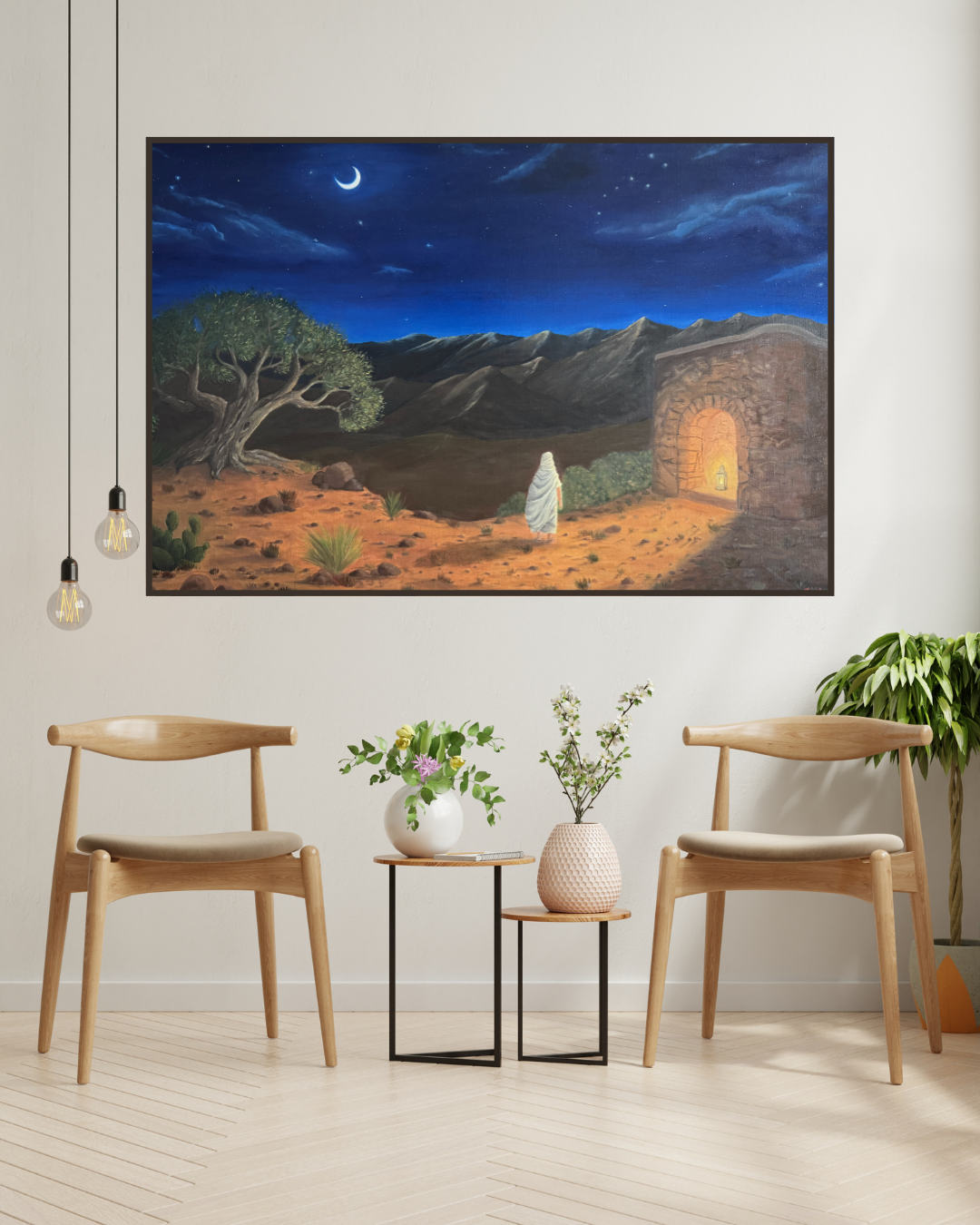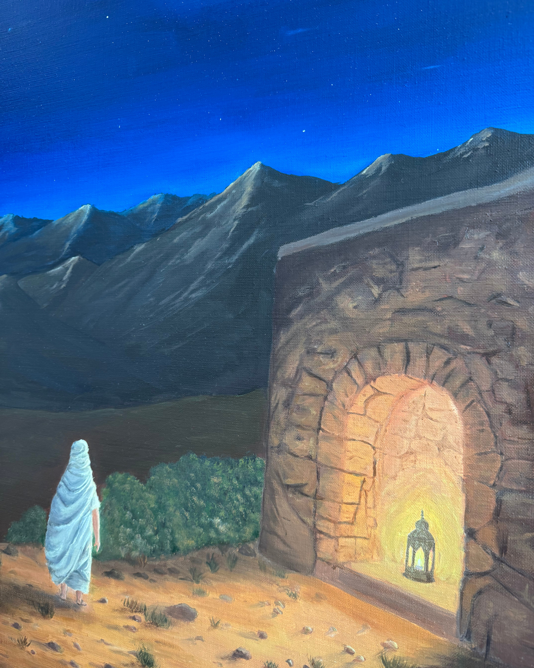 In this nocturnal, desert landscape, a figure advances resolutely towards a luminous lamp, symbolizing the quest for divine light and knowledge. The starry sky that envelops the painting invites contemplation and wonder, making this work a true source of inspiration and peace.