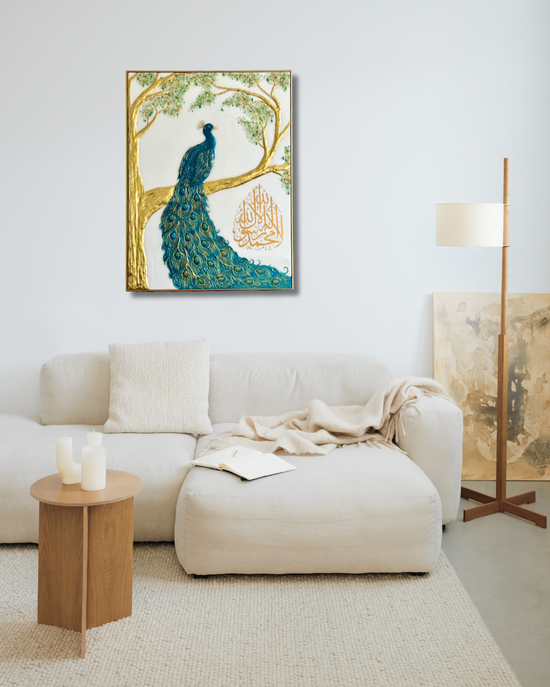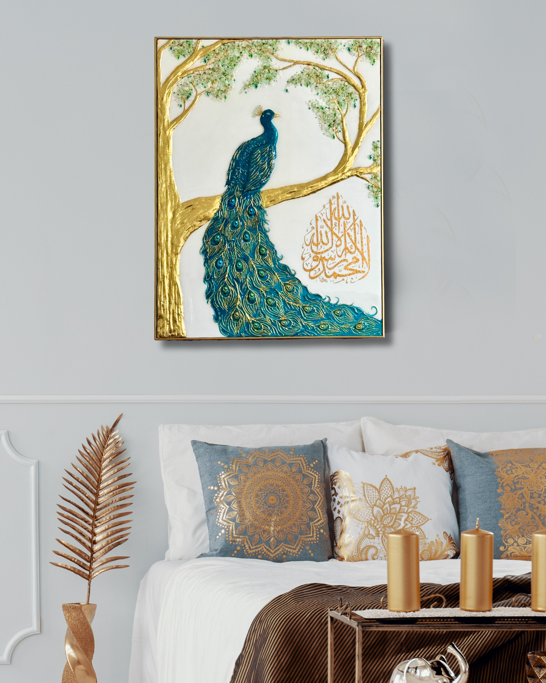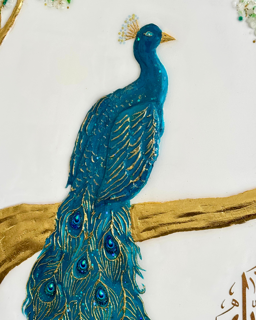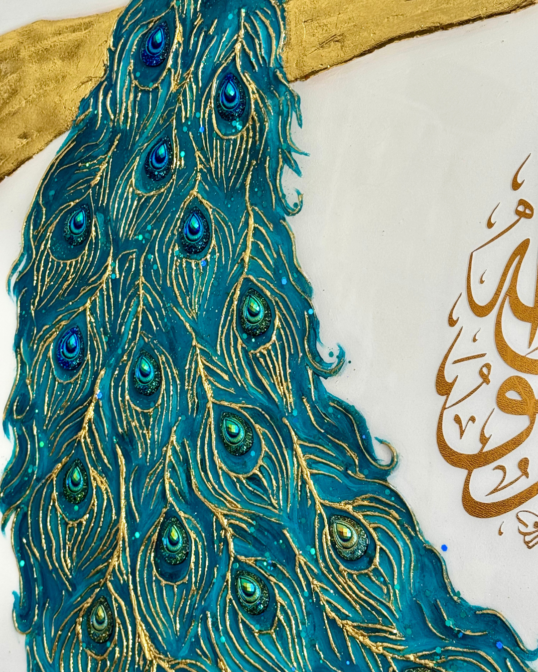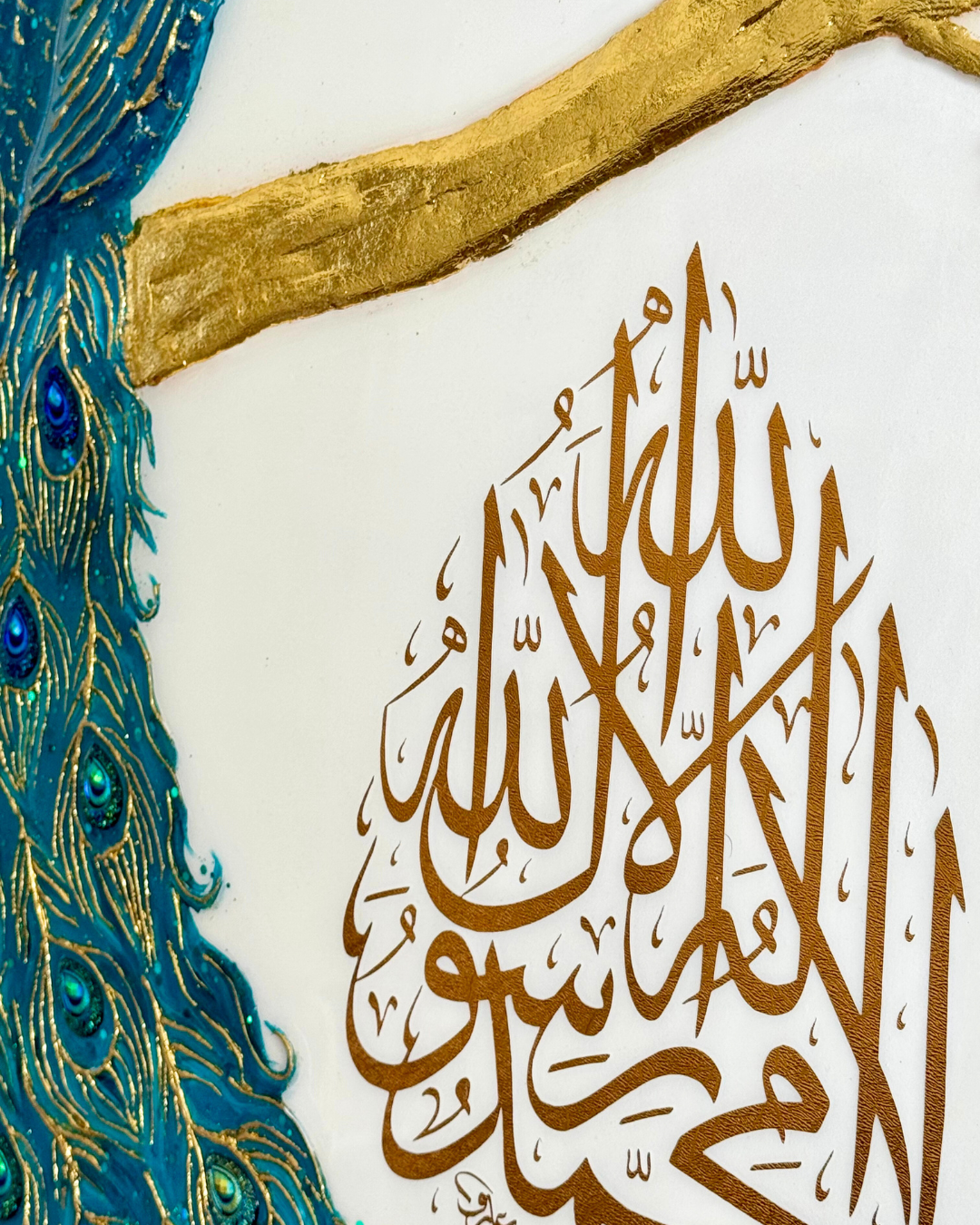 Près des plumes du paon, une shahada en vinyle doré vient enrichir l’œuvre d’une dimension spirituelle subtile et raffinée.