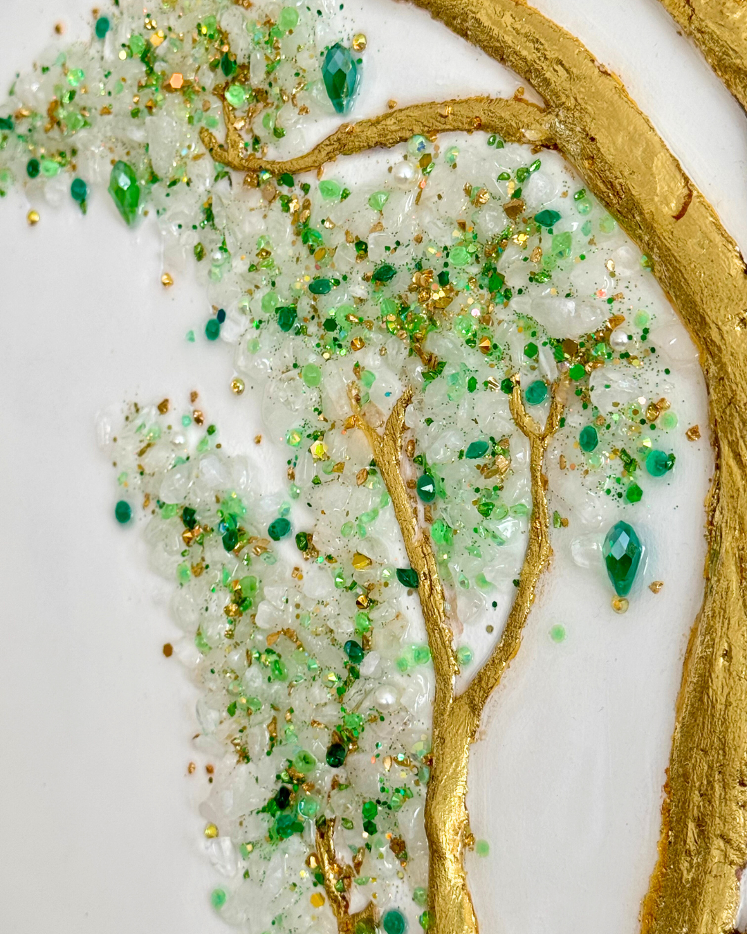 Travaillé en pâte texturée, le paon se déploie avec grâce sur un arbre sublimé par de délicates feuilles dorées, des cristaux de quartz et des cristaux verts aux reflets holographiques.