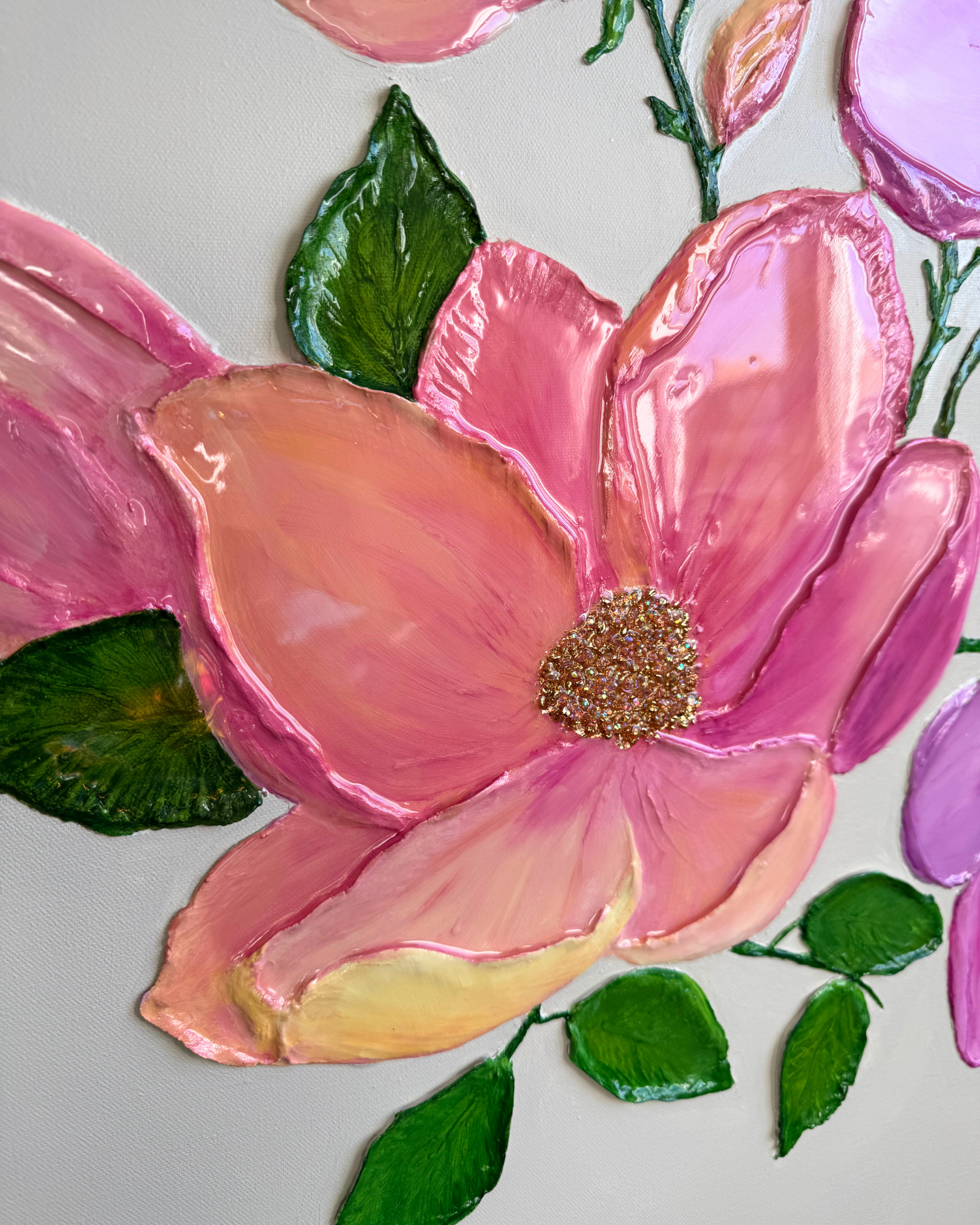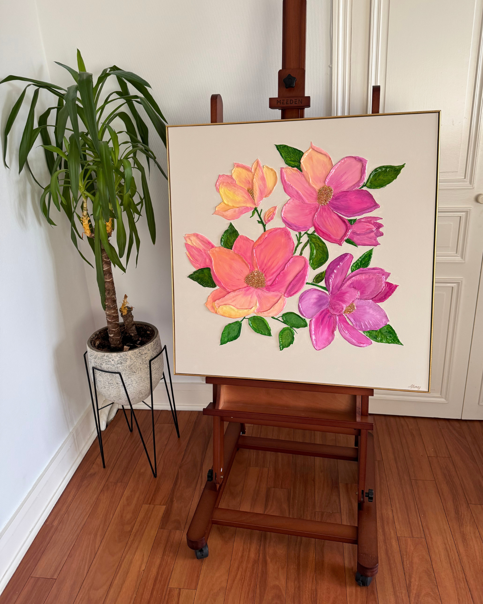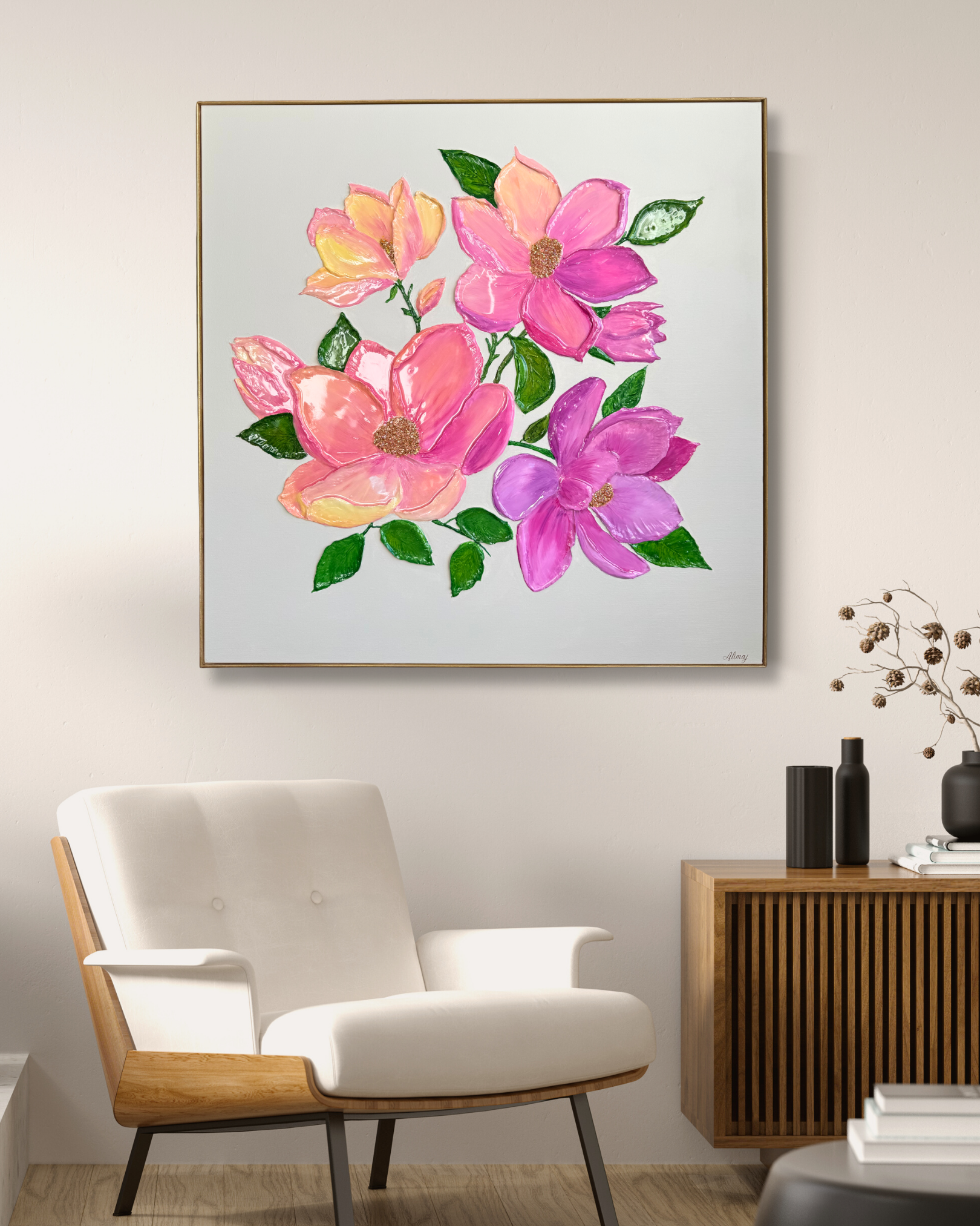 Découvrez une œuvre vibrante de 80 x 80 cm, où la délicatesse du fond beige lin met en valeur un bouquet de fleurs éclatantes. Les teintes rosées, violettes, orangées et jaunes apportent une énergie lumineuse. Au cœur de chaque fleur, des cristaux scintillants et des feuilles métalliques dorées captent la lumière, ajoutant une touche de magie. Seules les fleurs et les feuilles sont recouvertes de résine brillante, tandis que le fond reste mat pour un contraste raffiné. Le tout est élégamment encadré dans un cadre en MDF verni doré, ajoutant une finition luxueuse à cette pièce pleine de vie.