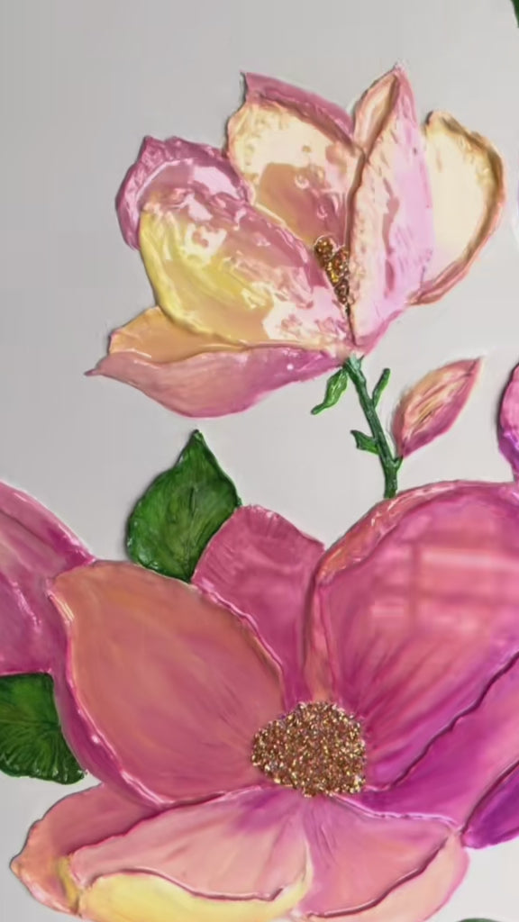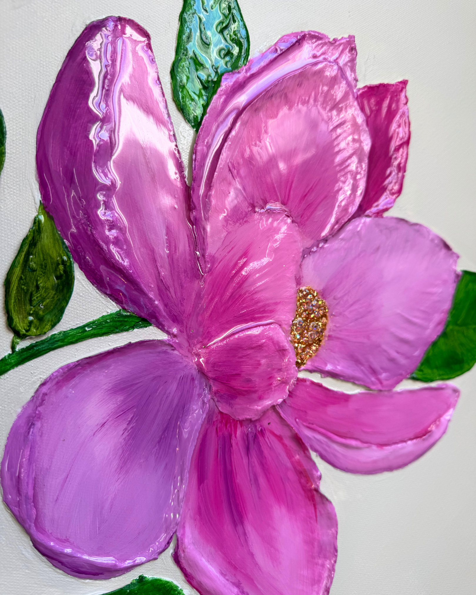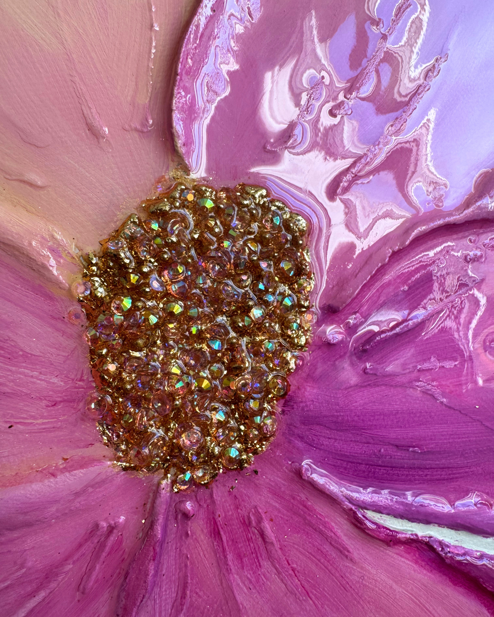 Découvrez une œuvre vibrante de 80 x 80 cm, où la délicatesse du fond beige lin met en valeur un bouquet de fleurs éclatantes. Les teintes rosées, violettes, orangées et jaunes apportent une énergie lumineuse. Au cœur de chaque fleur, des cristaux scintillants et des feuilles métalliques dorées captent la lumière, ajoutant une touche de magie. Seules les fleurs et les feuilles sont recouvertes de résine brillante, tandis que le fond reste mat pour un contraste raffiné. Le tout est élégamment encadré dans un cadre en MDF verni doré, ajoutant une finition luxueuse à cette pièce pleine de vie.