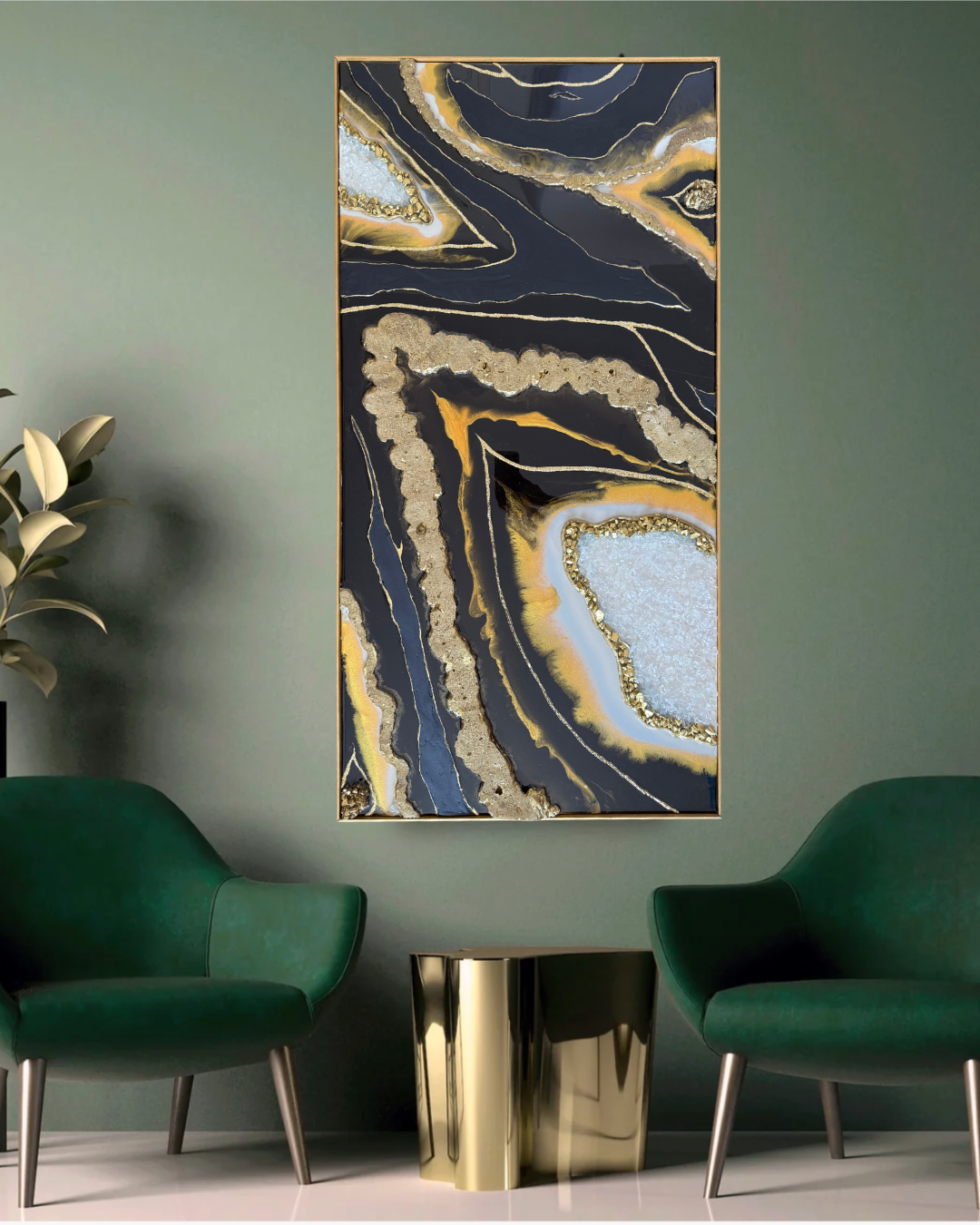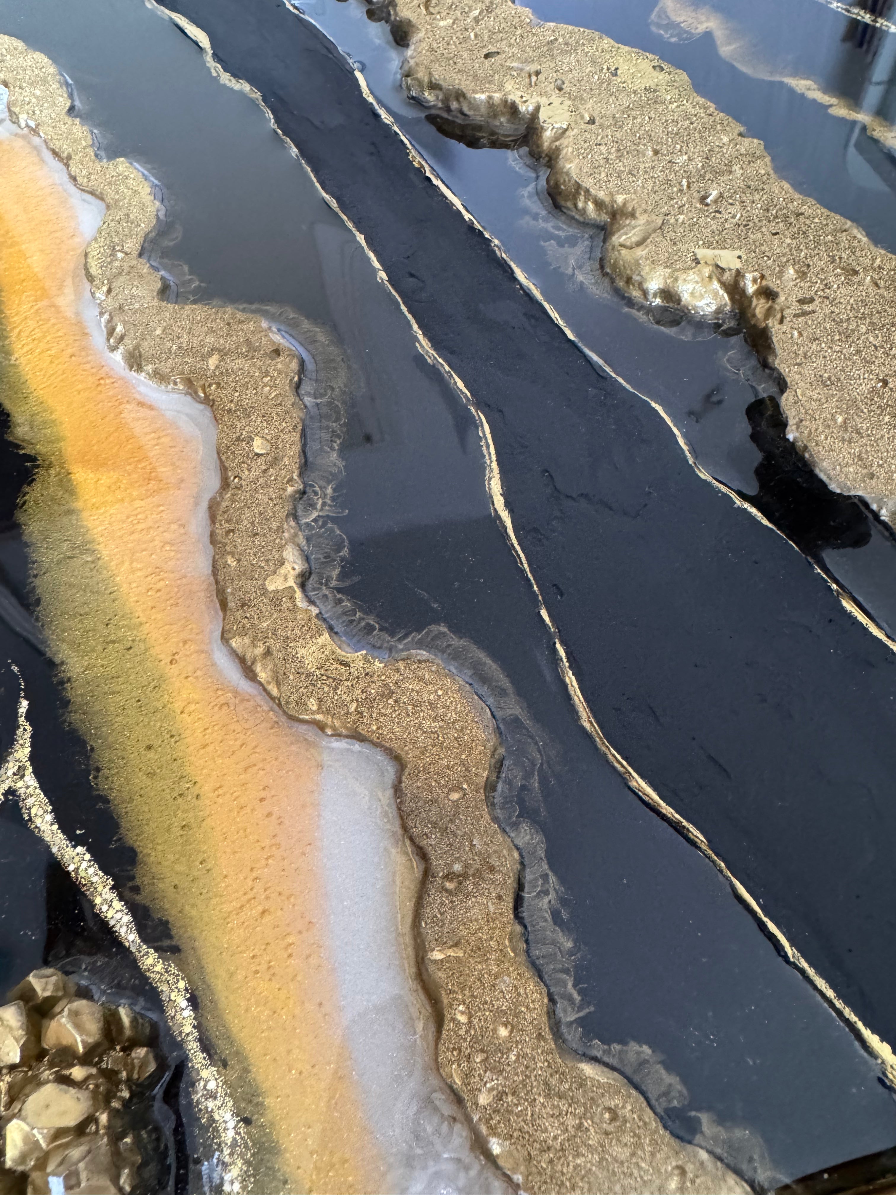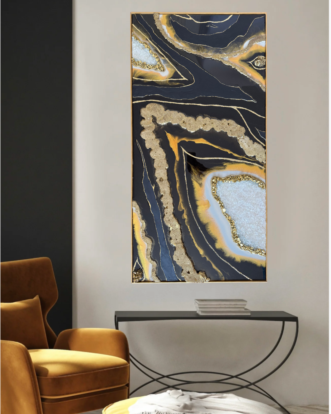 Le fond en résine noire profonde est structuré avec de la pâte texturée noire, créant du relief et une sensation de matière brute. Des incrustations de cristaux de verre pilé reflètent la lumière et apportent un éclat intense, contrastant avec la chaleur des détails dorés appliqués avec du vernis or métallique. L’ensemble évoque une géode précieuse, entre art naturel et design contemporain.