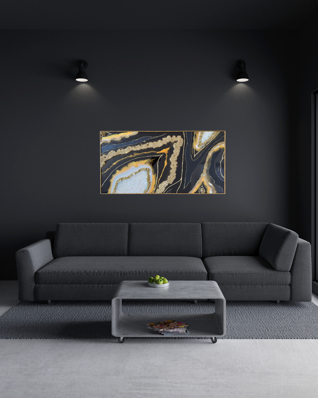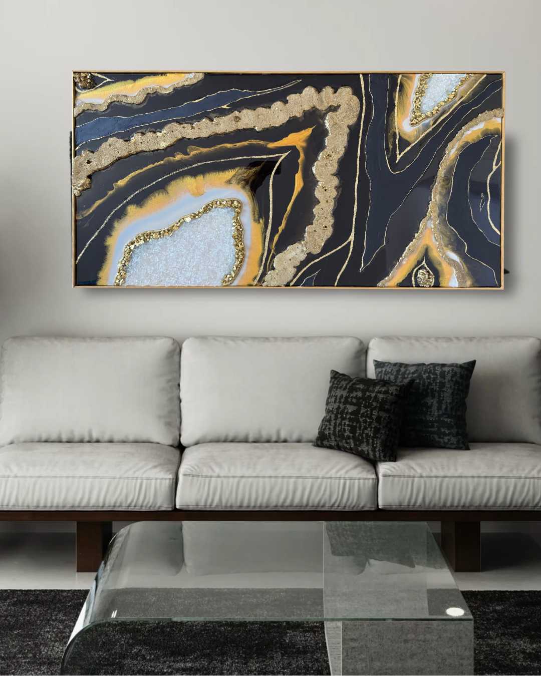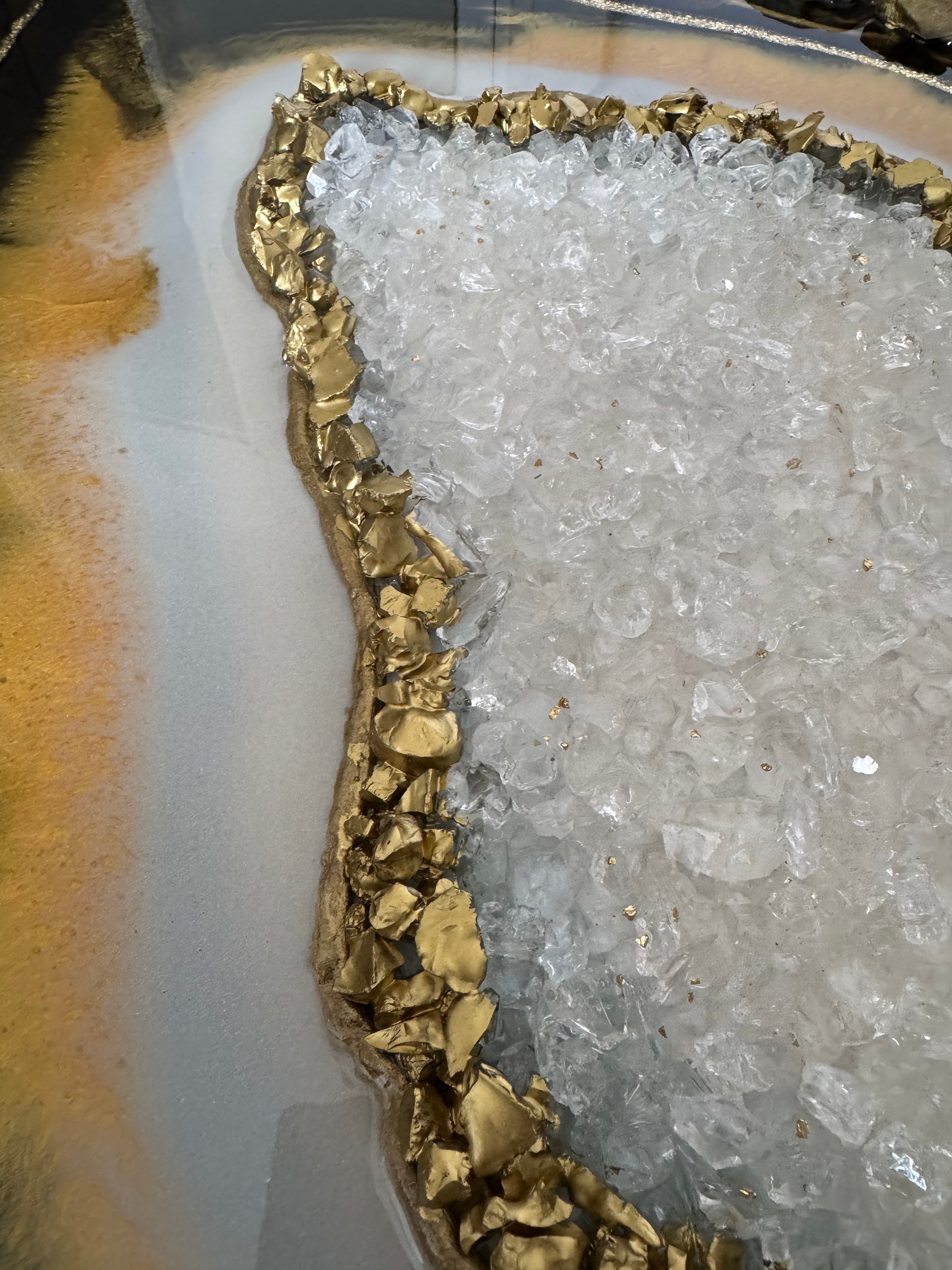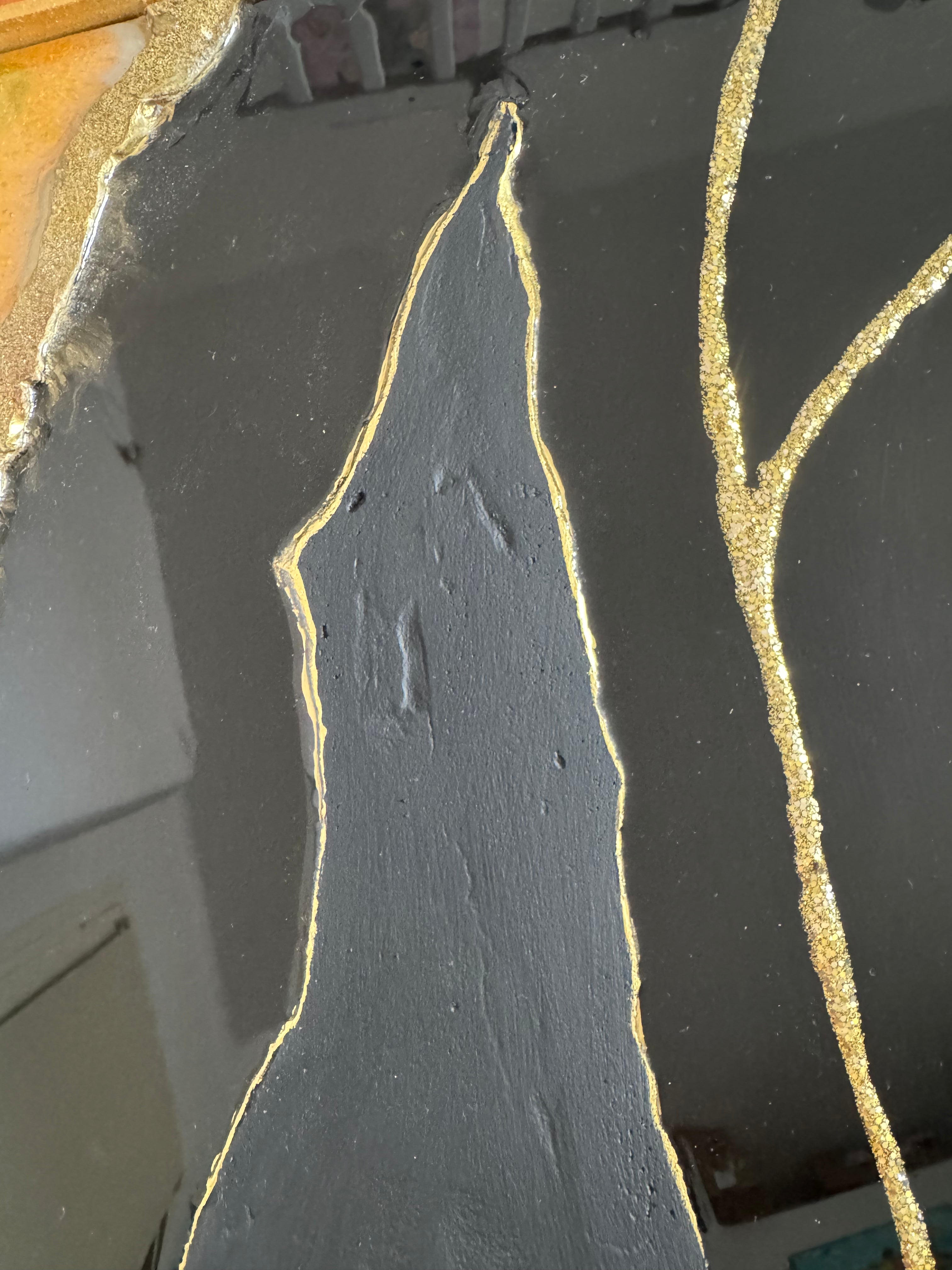 Le fond en résine noire profonde est structuré avec de la pâte texturée noire, créant du relief et une sensation de matière brute. Des incrustations de cristaux de verre pilé reflètent la lumière et apportent un éclat intense, contrastant avec la chaleur des détails dorés appliqués avec du vernis or métallique. L’ensemble évoque une géode précieuse, entre art naturel et design contemporain.